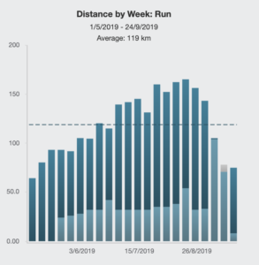 Looking at their weekly mileage below you will notice that there aren’t any real easy weeks, sure some weeks were a little easier but in general, the volume stayed up. This is only possible when the athlete ensures easy session is easy, they back off hard sessions when the body isn’t up to it and prioritise sleep and recovery. The coach also needs to ensure the athlete can handle the training load each week before increasing it further. If you over step the mark then you need to compensate for that with a much easier week. Fortunately, through good management and good communication between athlete and coach, this never happened and we were able to keep the training load high throughout.